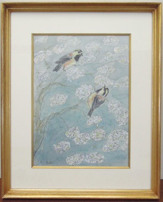 尾崎良二 『プラムの花に山雀』 パステル4号