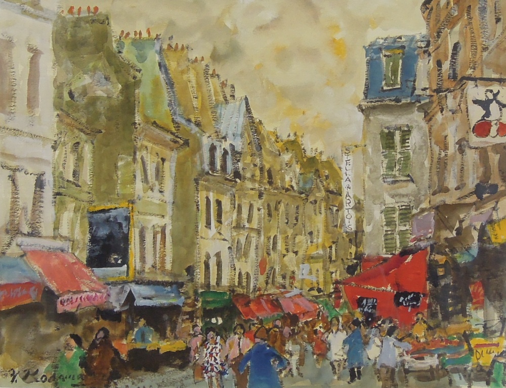 パリでもっとも賑わう通りを描いた児玉幸雄の特徴がよくでた水彩画です。