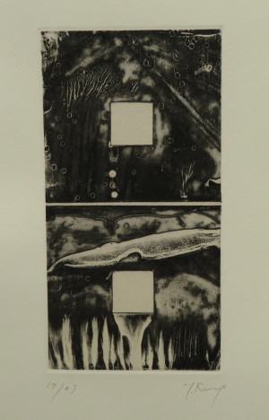 かのう・みつお 1933年東京生まれ 19歳の頃より独学で銅版画をはじめる 1956年初個展 日本国際美術展優秀賞、東京国際版画ビエンナーレ展近代美術館賞など 1980年代には油彩作品などもはじめ、詩人との共作や舞台美術、書籍の装丁など幅広く活動 |