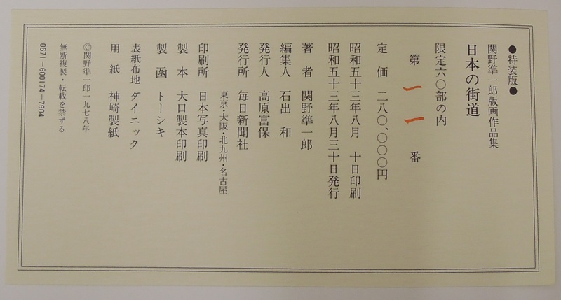 せきの・じゅんいちろう 1914年青森県生まれ 現代の浮世絵師と称し、とくに素朴な風景を愛して「東海道五十三次」「奥の細道」の道シリーズなどを制作 帝展入選、ノースウエスト国際版画展シアトル美術館賞、アジア・アフリカ美術展賞、リユプリア国際版画展優秀賞、芸術選奨文部大臣賞など 日本版画協会会員 1988年歿 |