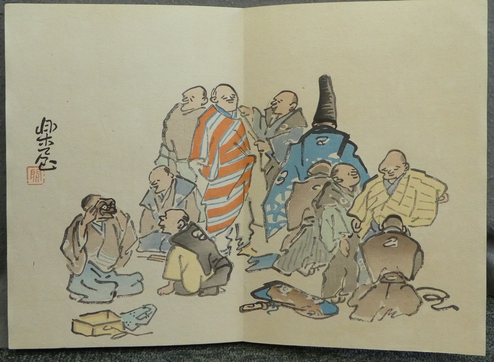 狂言をモチーフにした手彩色木版画全26図を収録した画帖です