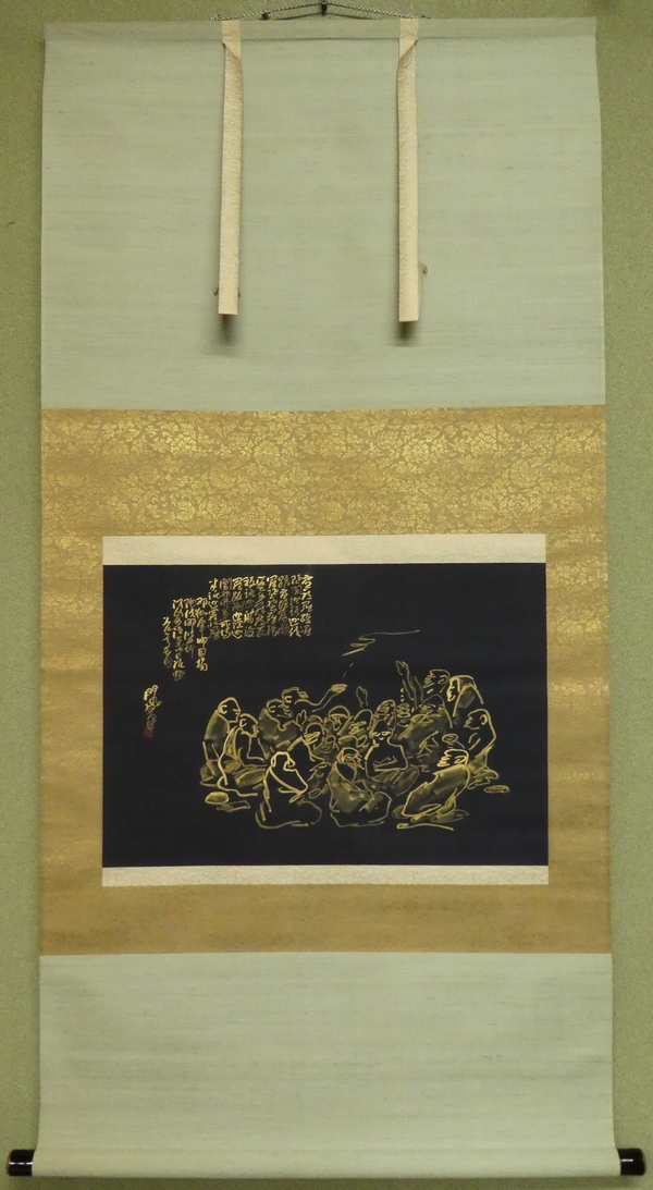 門水独特の剽軽な仏画を紺地金泥で描いた掛軸です