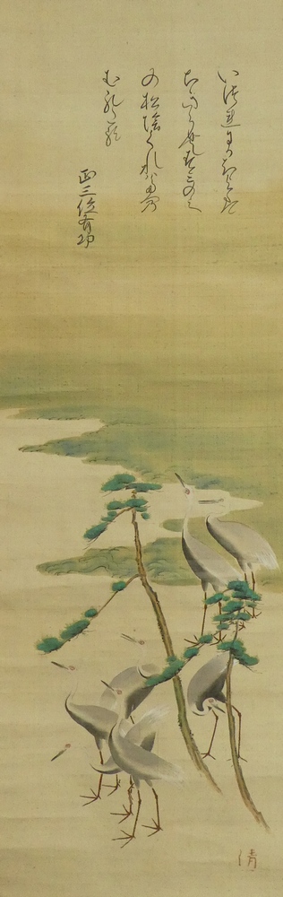 清が鶴を描き、公家で歌人の千種有功が歌を書いた掛軸です