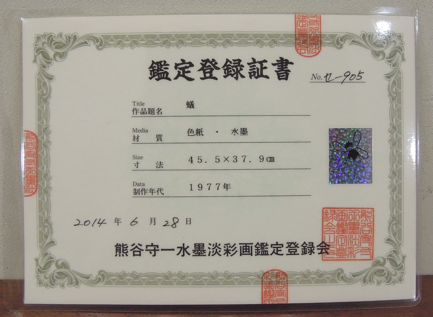 「熊谷守一水墨淡彩画鑑定登録会」の鑑定登録証書付き